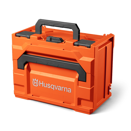 Die Husqvarna Akku Box L ist eine robuste und handliche Box für den Transport und die Aufbewahrung von bis zu 6 Husqvarna 36 V Lithium-Ionen-Batterien der Größe L*. Ergonomische Griffe vorne und oben für eine einfache Handhabung. Das durchdachte Design ermöglicht das Stapeln mehrerer Boxen und durch Hinzufügen der Husqvarna Multi-Adapterplatte (separat erhältlich) können die Boxen auch an Koffersysteme von Drittanbietern angeschlossen werden. *Husqvarna Batterien der Größe L = BLi30/BLi300