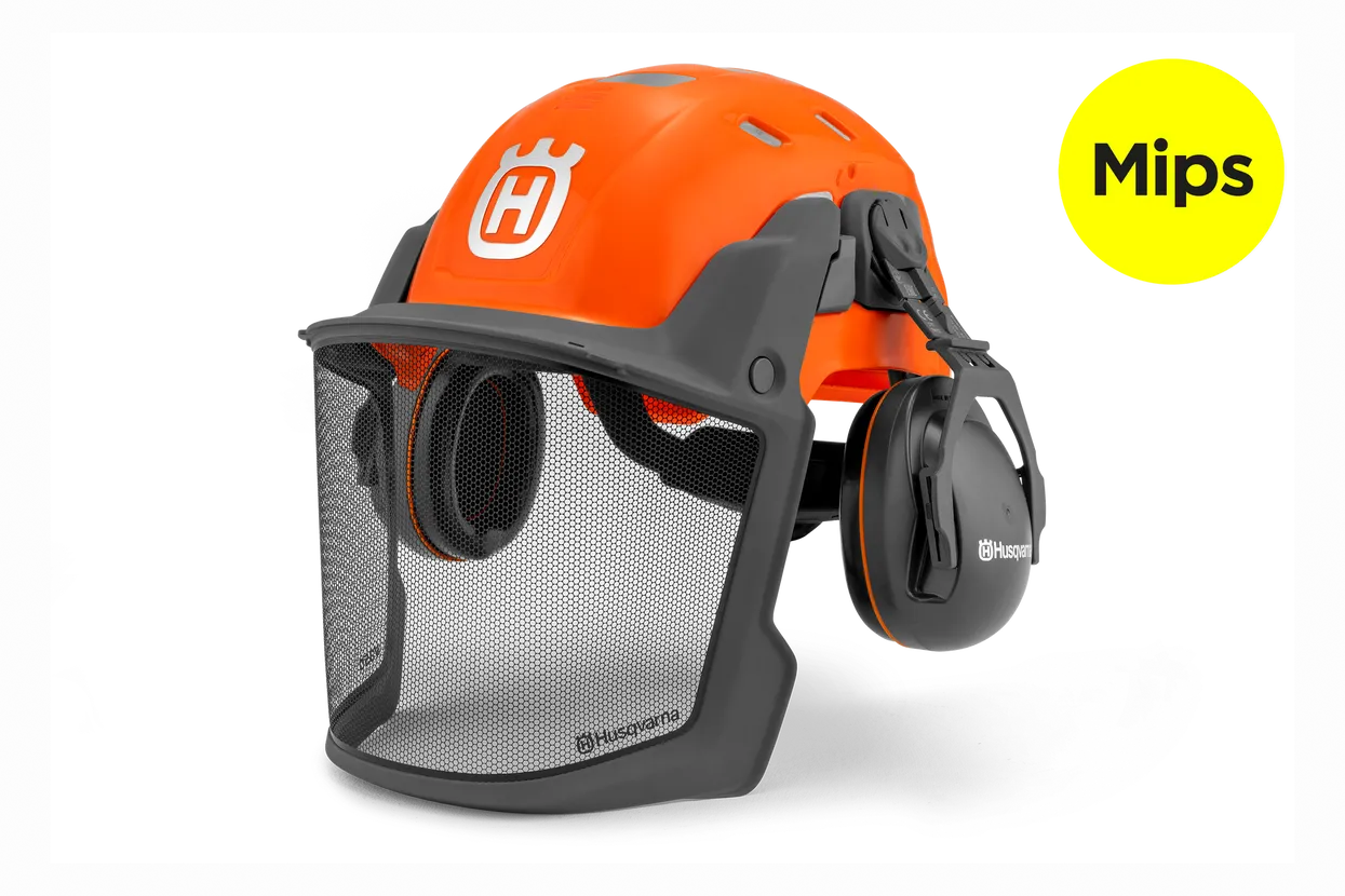 Der Technical Helm von Husqvarna ist mit Mips®-Sicherheitssystem für Forsthelme ausgestattet. Dieser robuste und dennoch leichte Forsthelm bietet Gehörschutz, Visier und Nackenschutz. Er ist modular aufgebaut, sodass Sie Visier und Gehörschutz an Ihre Anforderungen anpassen können. Das Visier umschließt Ihr Gesicht und bietet ein hervorragendes Sichtfeld, egal ob es geöffnet oder geschlossen ist. So ist eine ungehinderte Sicht auf die Baumkronen gewährleistet. Insgesamt ist der Helm so komfortabel, dass Sie sich voll auf Ihre Arbeit konzentrieren können.
